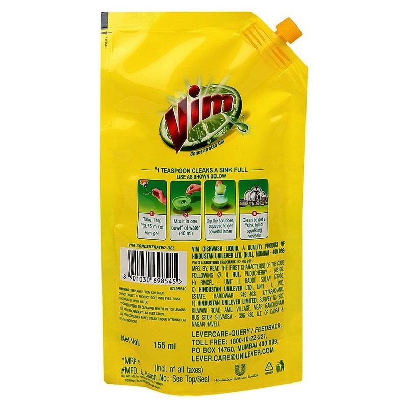 5. Vim Dishwash Liquid Gel is available in different sizes and packaging in the market which includes bottles and pouch packs